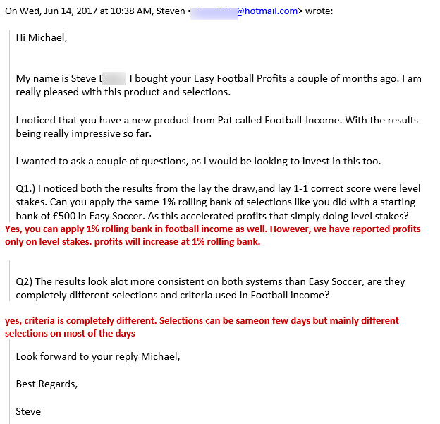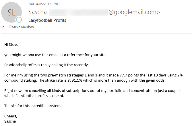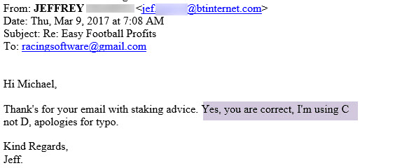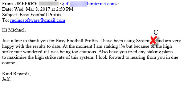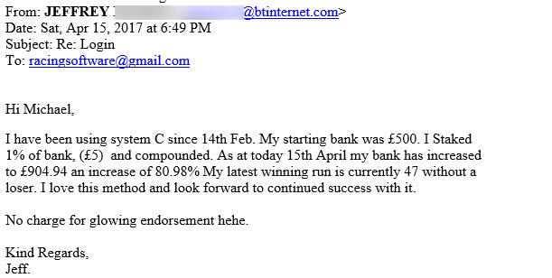 But, there is always a but. We will spoon feed you for 2 months with the selected matches each day for 60 days minimum. So you can do the form and check it against the ones we have found, so like a check sheet. You can then hone your Football form skills. Now, if you are one of those "time poor" or stone lazy, then after the 60 days, of the free selections, YES you can for a modest fee continue to get them from us. So relax. How did the Easy Football Profits systems evolve? One of our clients, Pat from the Emerald Isle sent us an email a while back sending his results sheet, first on one system, and then eventually all four of them. The results are very good and consistant. (see upto date results in the graphics below.) System A (Laying the Draw) Fulltime: Low odds. £500 bank is at £7,183.00 (9th January, 2017) since 14th June, 2016 (30 months) and over 1,800 bets. System B ( Laying the Fulltime Draw at halftime), £500 bank is now at £3,747.00 over 30 months on just over 300 bets. System C (Laying the Fulltime 1-1 Correct score) £500 bank is now at a staggering £73,729.00 over 34 months, and over 1900 bets, with a 91% strike rate. System D (Laying the fulltime draw at halftime), £500 bank is now at £1,182.00 over 30 months on just over 1,125 bets.