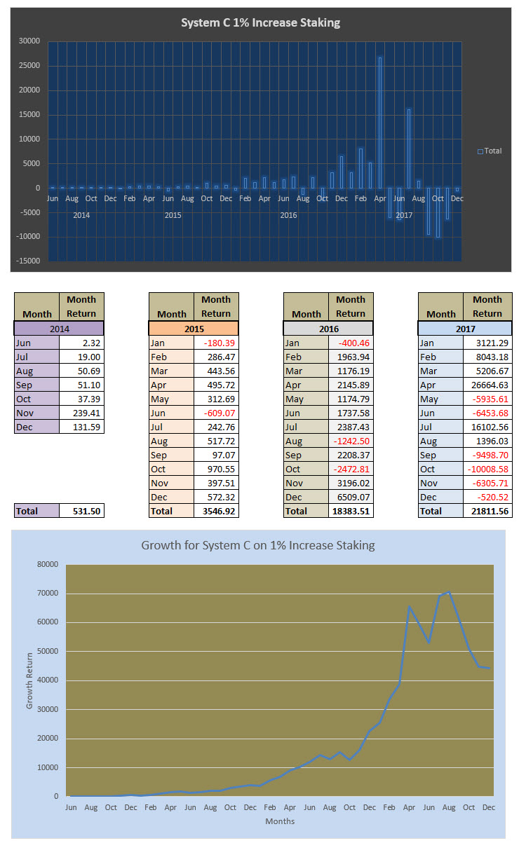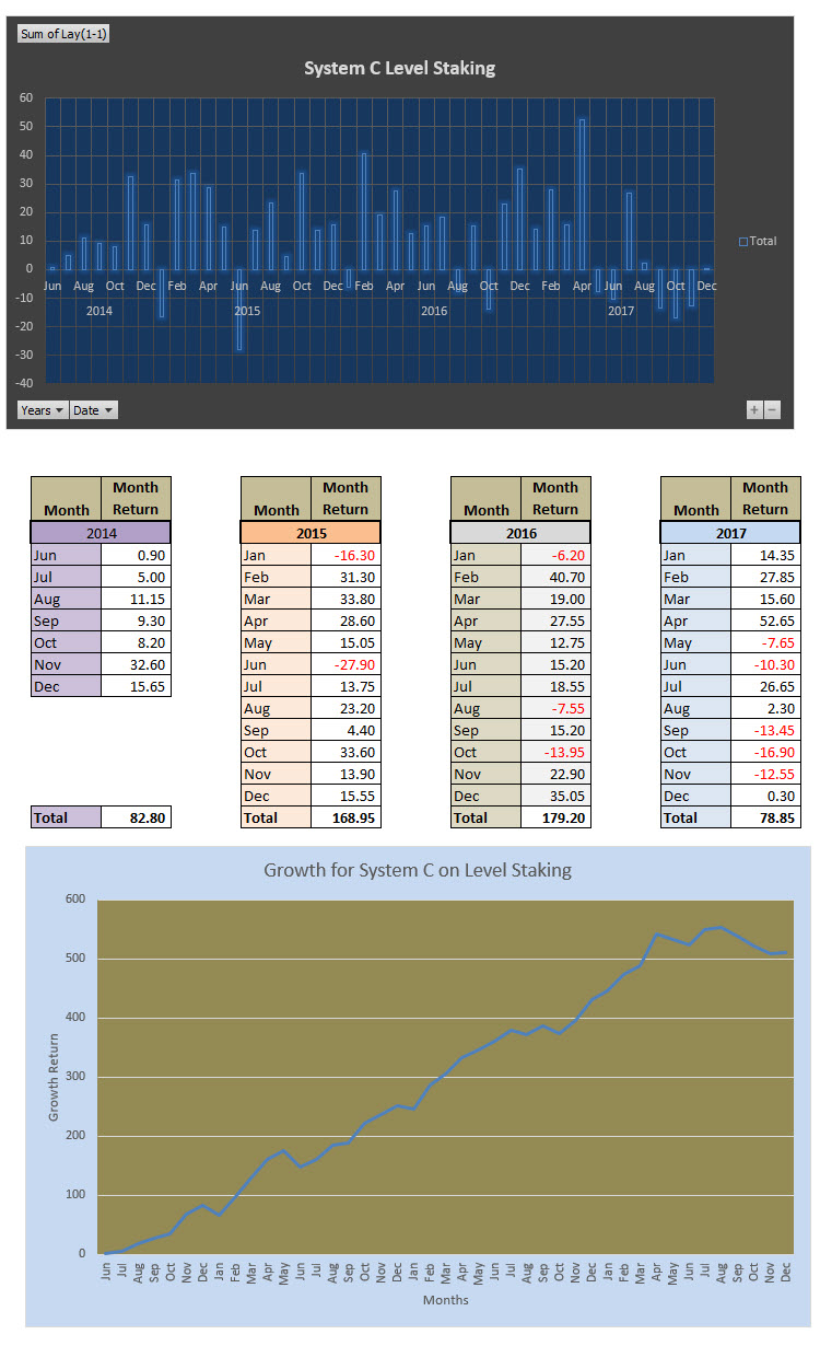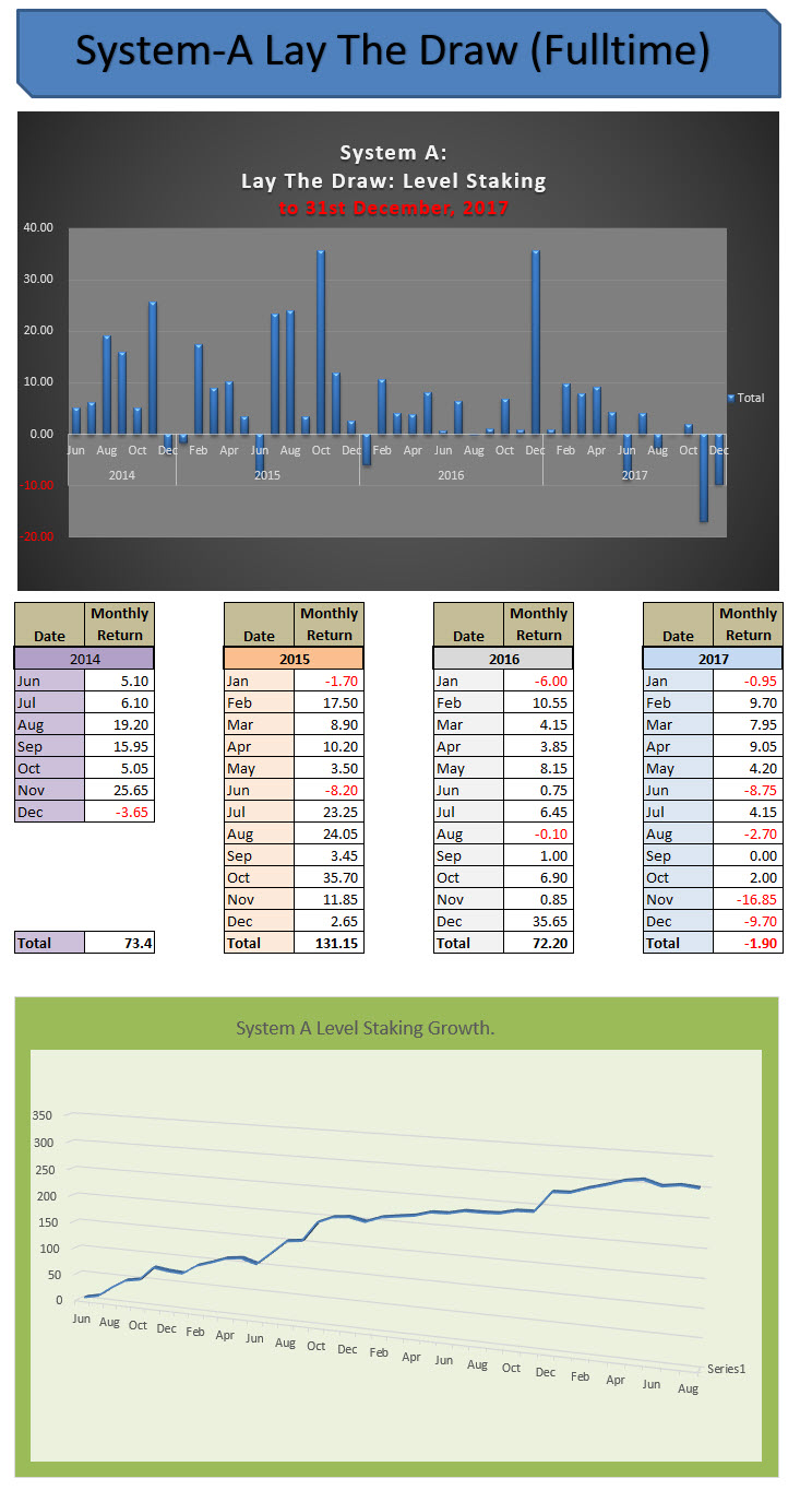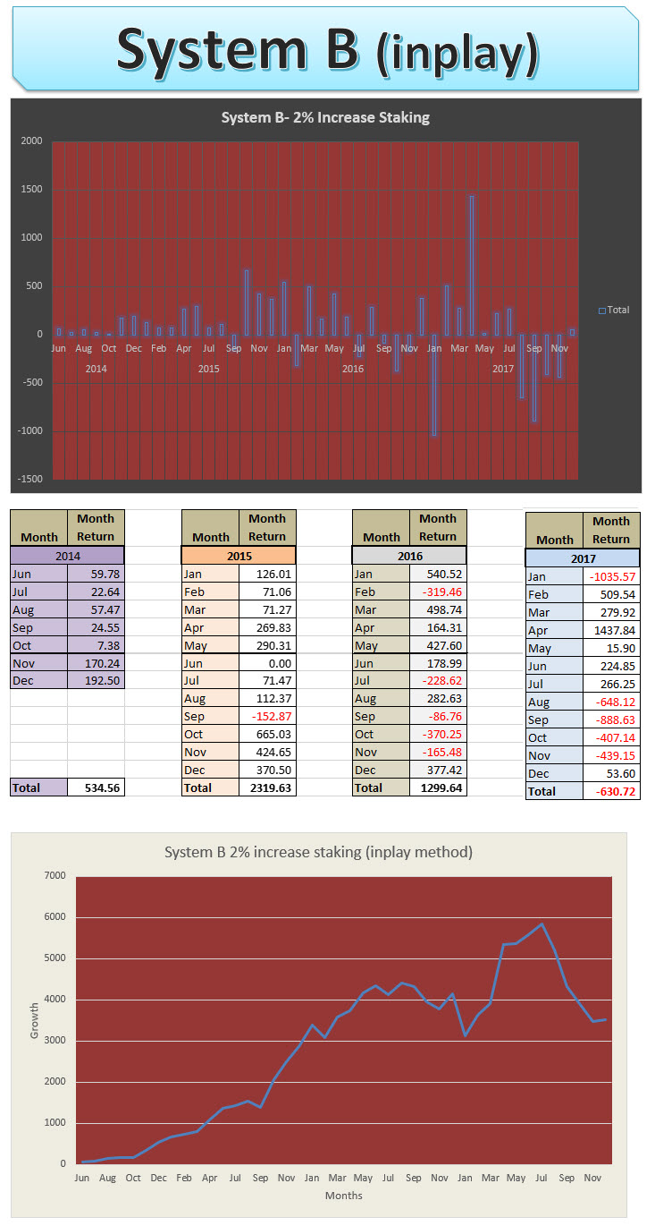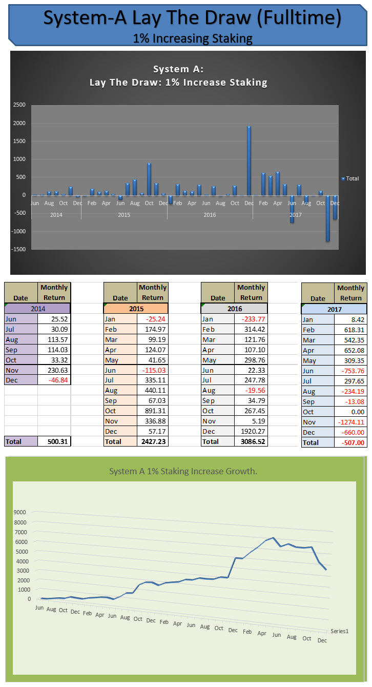 System A on 1% of the Bank Staking.The staking is betting 1% of the bank, so as the bank builds the bets increase, and if the bank falls the bets decrease. Bank has increase to 5,607.06 in 36 months.